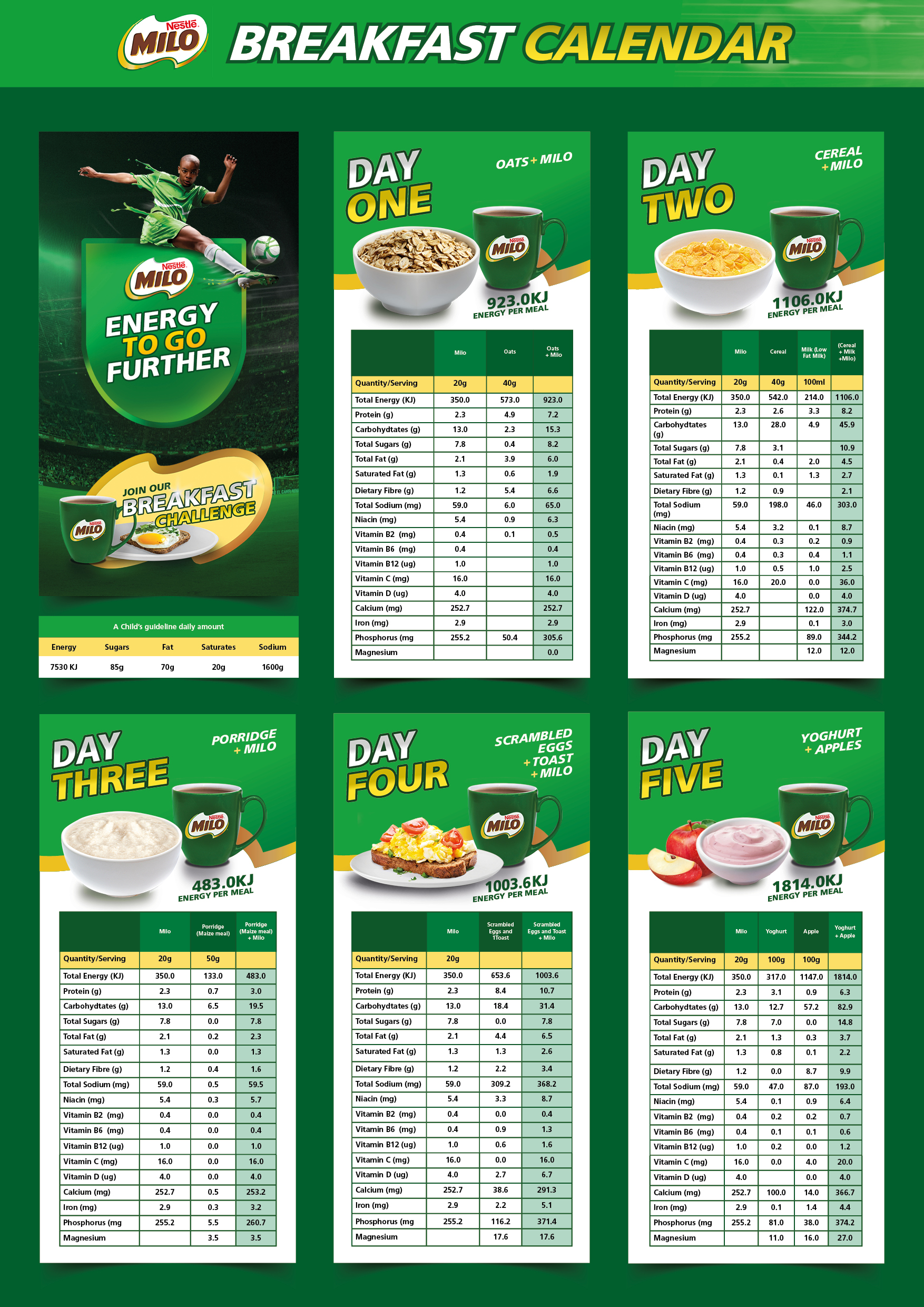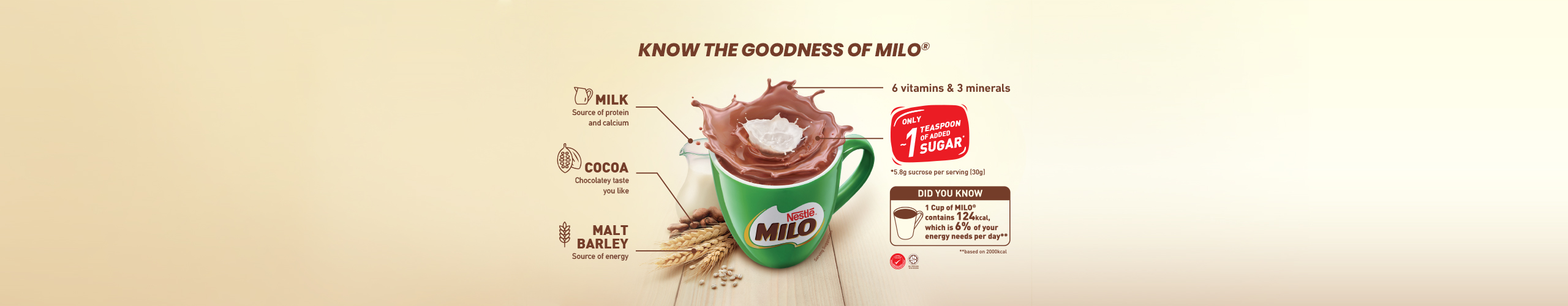 Each cup of MILO® has the natural goodness of malt barley, milk, cocoa, 6 vitamins and 3 minerals, plus only ~1 teaspoon of added sugar (sucrose). All these nutritious goodness gives you energy to take on the day!